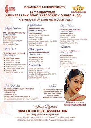 Indian Bangla Club presents Andheri Link Road Sarbojanik Durga Puja 2025 – Celebrating Culture, Devotion & Social Responsibility from 27th September to 2nd October Indian